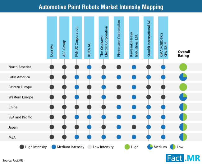 The study forecasts the Automotive Paint Robot Market to majorly remain consolidated among Tier 1 players, who will hold over 80% value share of the market in 2018. While these players continue with the new product development, collaboration, and merger & acquisition strategies to retain their market buoyancy, Tier 2 and Tier 3 players are focusing on expansion in domestic markets, and advanced machinery purchase to gain significance in the market.