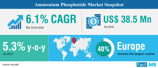 The Fact.MR study provides comprehensive insights about futuristic outlook of the ammonium phosphatide market between 2018 and 2028. The study opines that the ammonium phosphatide market will grow at a healthy 6.1% CAGR to exceed US$ 69 million by the end of forecast period.