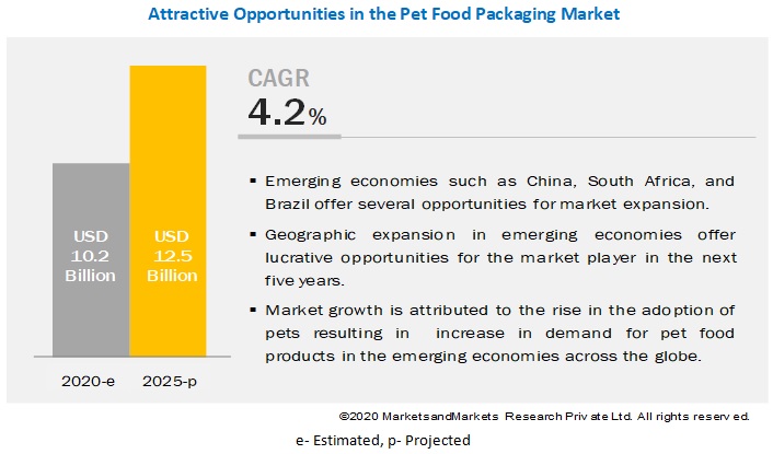 The global pet food packaging market size is projected to grow from USD 10.2 billion in 2020 to USD 12.5 billion by 2025, at a Compound Annual Growth Rate (CAGR) of 4.2% during the forecast year. Rising affection for pets leading to greater adoption of pets, high-income level of pet owners, changing lifestyles, demand for simplicity and convenience in packaging, and growing pet humanization trend are projected to support the growth in the pet food packaging industry in the coming years.