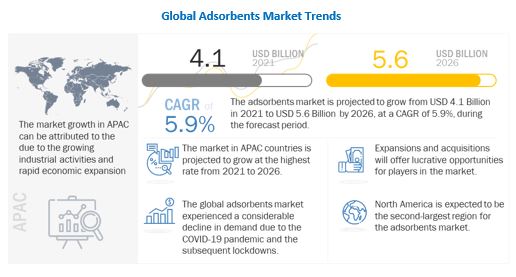 The global adsorbents market size is estimated to grow from USD 4.1 billion in 2021 to USD 5.6 billion by 2026, at a CAGR of 5.9% during the forecast period. The driving factors for the adsorbents market is the industry growth is backed by the large-scale developments in oil & gas processing and socio-economic advancements such as the increased use of adsorbents in maintaining purity standards in various applications and because of environmental concerns.