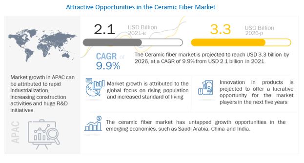 The report "Ceramic Fiber Market by Type (RCF, AES Wool), Product Form (Blanket, Module, board, Paper) End-use Industry (Refining & Petrochemical, Metals, Power Generation), and Region (APAC, Europe, North America, MEA, South America) - Global Forecast to 2026" The global ceramic fiber market is projected to reach USD 3.3 billion by 2026, at a CAGR of 9.9% from USD 2.1 billion in 2021. Ceramic fiber is a type of fibrous and lightweight refractory material mainly consisting of alumina, silica, and other oxides in small proportions. Its low-density properties make it suitable for high-temperature applications that require low thermal mass. Ceramic fiber products exhibit thermal stability, good electrical insulation, strength, durability, design flexibility, and wear & corrosive resistance. Owing to their low thermal conductivity, ceramic fiber products minimize the heat dissipation from the furnace or kiln and help in overall energy-saving.