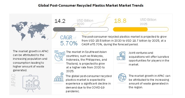 The global post-consumer recycled plastics market size is projected to grow from USD 14.2 billion in 2020 to USD 18.8 billion by 2025, at a Compound Annual Growth Rate (CAGR) of 5.7% during the forecast year. Post-consumer recycled resins or plastics are obtained by recycling the plastic waste collected from consumers. Consumer plastic waste includes bottles, films, and foams. Post-consumer plastic waste management includes recycling, recovery, and disposal of plastic waste. Additionally, waste management systems ensure the safe collection, segregation, storage, transportation, processing, and disposal of generated plastic waste. Post-consumer recycled resins also ensure that no harm is caused to the environment during this process and that the process is undertaken in accordance with the regulations and standards prescribed by governments or associations.