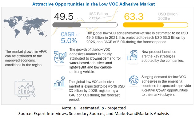 The Low VOC adhesives market is projected to grow from USD 49.5 Billion in 2021 to USD 63.3 Billion by 2026, at a CAGR of 5.0% between 2021 and 2026. APAC is estimated to be the largest consumer of Low VOC adhesives. The global Low VOC adhesives market is driven by the growing demand for water-based adhesives due to their flexibility, durability, and economic feasibility in the manufacturing, paper & packaging industry.