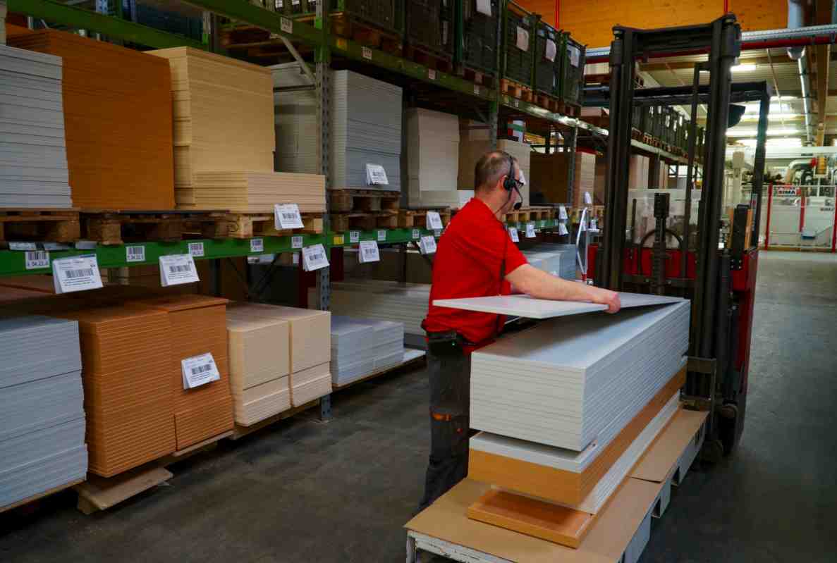 Das Picken von Möbelteilen ist für Assmann entscheidend. Bis zu sieben Kommissionierer picken täglich in zwei Schichten rund 4.500 Einzelteile, die anschließend in den Montagelinien zu Komplettmöbeln verarbeitet werden. Im Durchschnitt besteht ein Büromöbel von Assmann aus zehn verschiedenen Einzelteilen, wie zum Beispiel Seiten, Böden oder Türen.