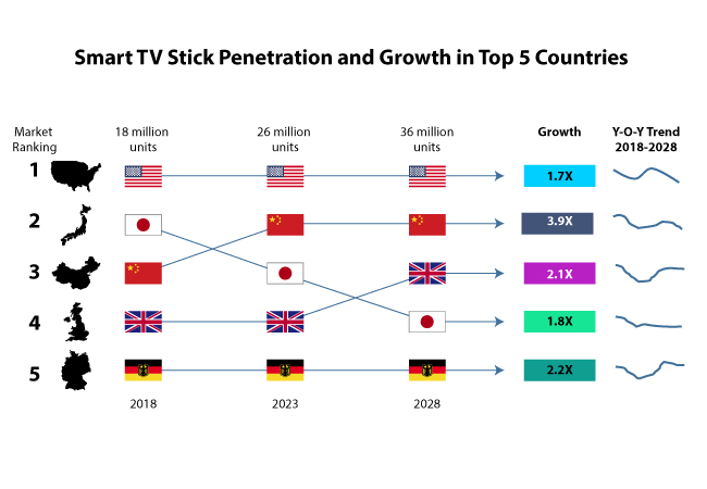 Sales of smart TV sticks are likely to remain concentrated in the developed regions of United States, given the high purchasing power parity of individuals in the country. However, emerging economies of Asia Pacific excluding Japan (APEJ) region, such as China and India have showcased high inclination toward adoption of smart TV sticks. The report forecasts that by end of 2028, the demand for smart TV sticks in China is projected to grow at a meteoric pace with its sales volume crossing 6 million units.