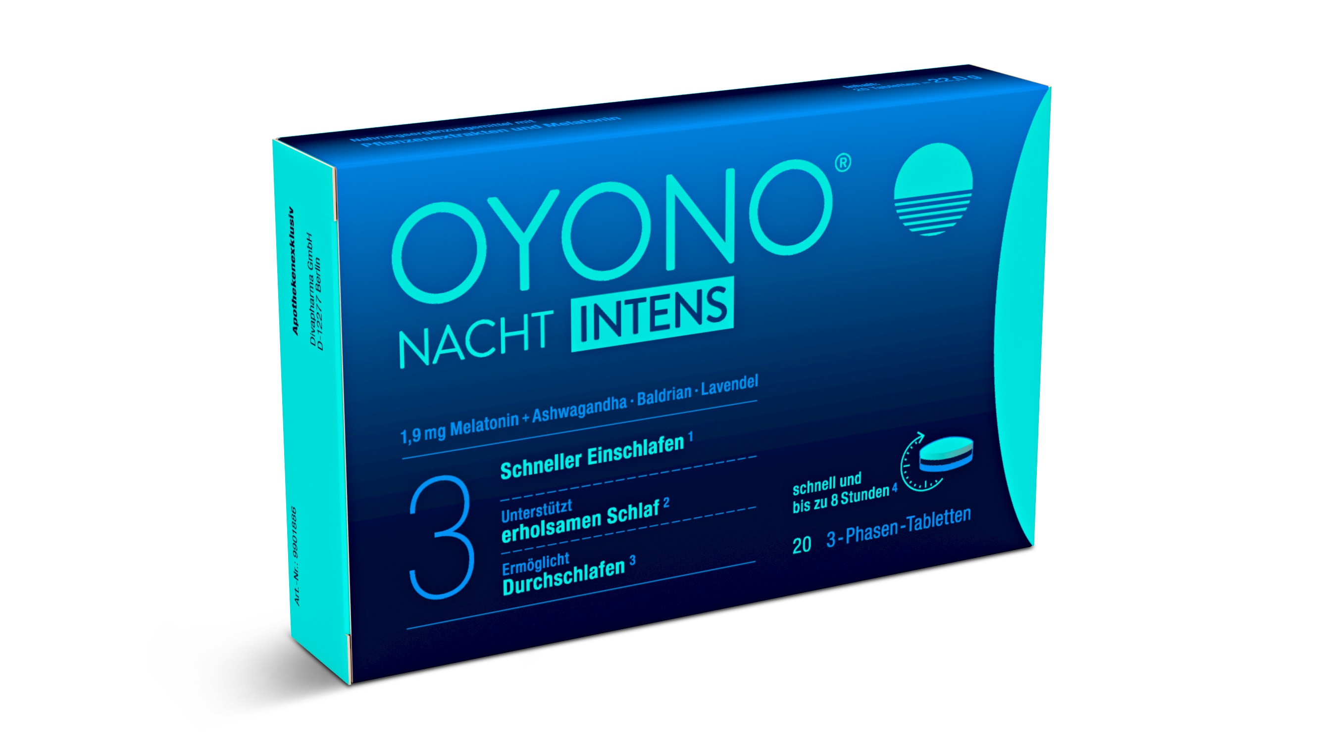 Für alle, die sich eine starke Unterstützung beim Ein- und Durchschlafen wünschen, wurde OYONO® NACHT INTENS entwickelt. OYONO® NACHT INTENS kombiniert auf neue und einzigartige Weise die pflanzlichen Extrakte aus Baldrian, Lavendel und Ashwagandha mit 1,9 mg Melatonin. Dabei nutzt OYONO® NACHT INTENS die bereits bewährte 3-Phasen-Technologie, die zeitlich versetzt die Inhaltsstoffe freigibt: In der Sofort-Phase werden Melatonin und Ashwagandha schnell freigesetzt. Melatonin trägt dazu bei, die Einschlafzeit zu verkürzen und Ashwagandha unterstützt das Einschlafen. Ashwagandha, hierzulande auch Schlafbeere genannt, wird in der ayurvedischen Tradition bei Schlafstörungen verwendet. Trotz des Namens werden in OYONO® NACHT INTENS jedoch die Wurzeln und Blätter der Pflanze eingesetzt und nicht die Beere selbst. Das wachsende Interesse an den möglichen Einsatzgebieten für Ashwagandha spiegelt sich in der aktuellen Studienlage wider. Unter anderem wurden die positiven Effekte im Bereich Schlaf untersucht. In der Chrono-Phase wird Baldrian und Lavendel freigesetzt. Lavendel unterstützt die Erholung und trägt zu einem besseren Schlaf bei. Die Auflösung der Depot-Phase hält bis zu 8 Stunden an. In dieser Phase werden langanhaltend und verzögert Melatonin und Baldrian während der Nacht freigegeben. Baldrian unterstützt das Durchschlafen. Durch die zeitlich fein abgestimmte Freisetzung der Inhaltsstoffe, kann OYONO® NACHT INTENS ein schnelleres Einschlafen fördern , den erholsamen Schlaf unterstützen und das Durchschlafen ermöglichen .