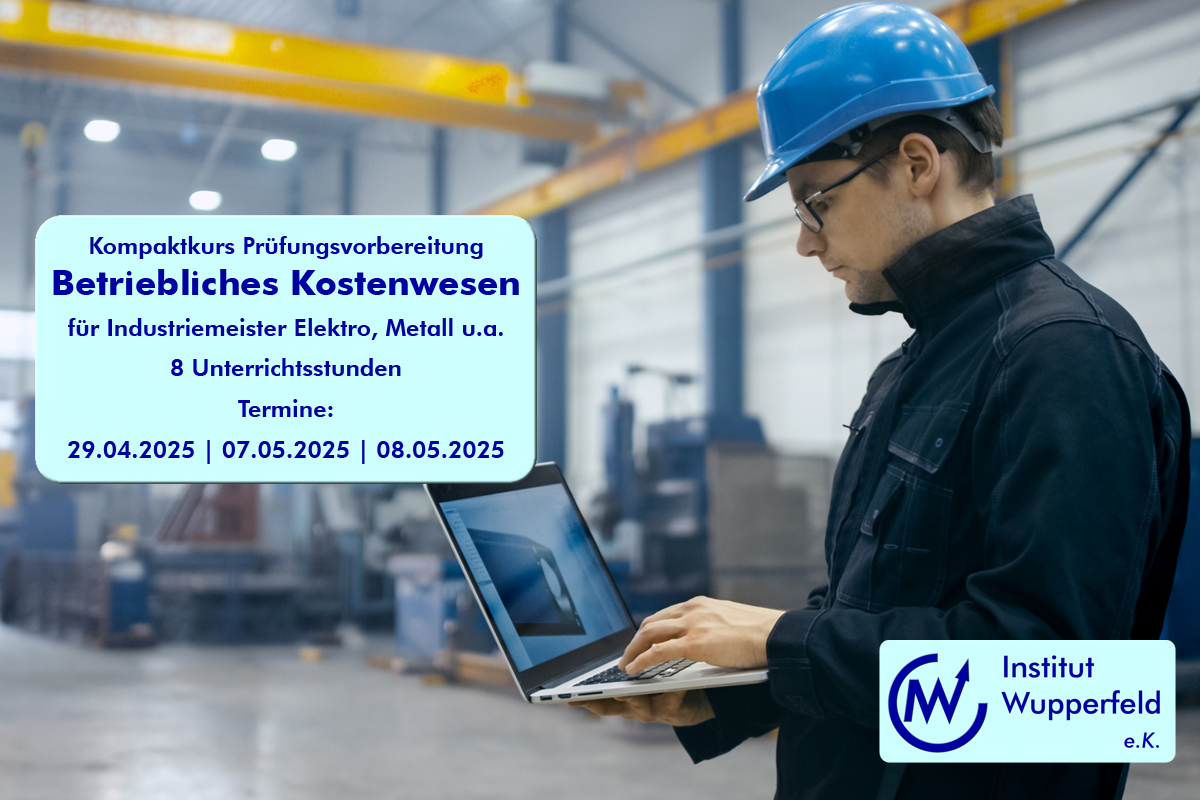 Das Institut Wupperfeld bietet einen kompakten 8-stündigen Prüfungsvorbereitungskurs an, der speziell auf die Bedürfnisse von Industriemeistern zugeschnitten ist. Der Kurs startet am 29. April 2025 und fokussiert sich auf die wichtigsten Themen des Betrieblichen Kostenwesens. Mit praxisnahen Übungen, klar strukturierten Inhalten und wertvollen Tipps bereitet der Kurs Sie optimal auf die Prüfungsanforderungen vor.