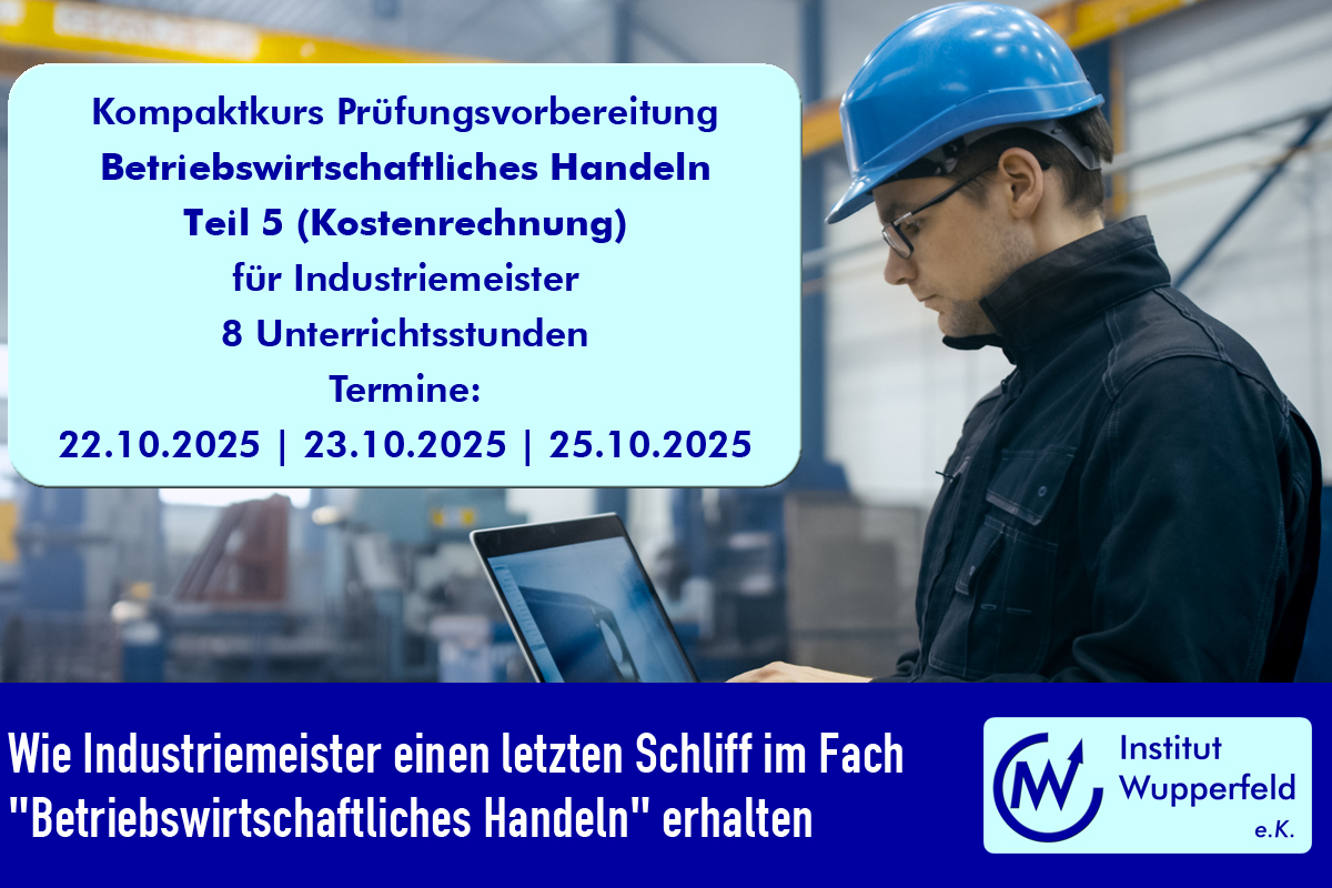 Genau hier setzt das Prüfungsvorbereitungsangebot des Institut Wupperfeld an. Mit einem kompakten, praxisnahen Kurs erhalten angehende Industriemeister die Möglichkeit, ihr Wissen gezielt aufzufrischen und zu vertiefen. Der Kurs umfasst 8 Stunden intensiven Online-Unterricht, in dem die prüfungsrelevanten Inhalte strukturiert aufgearbeitet werden.