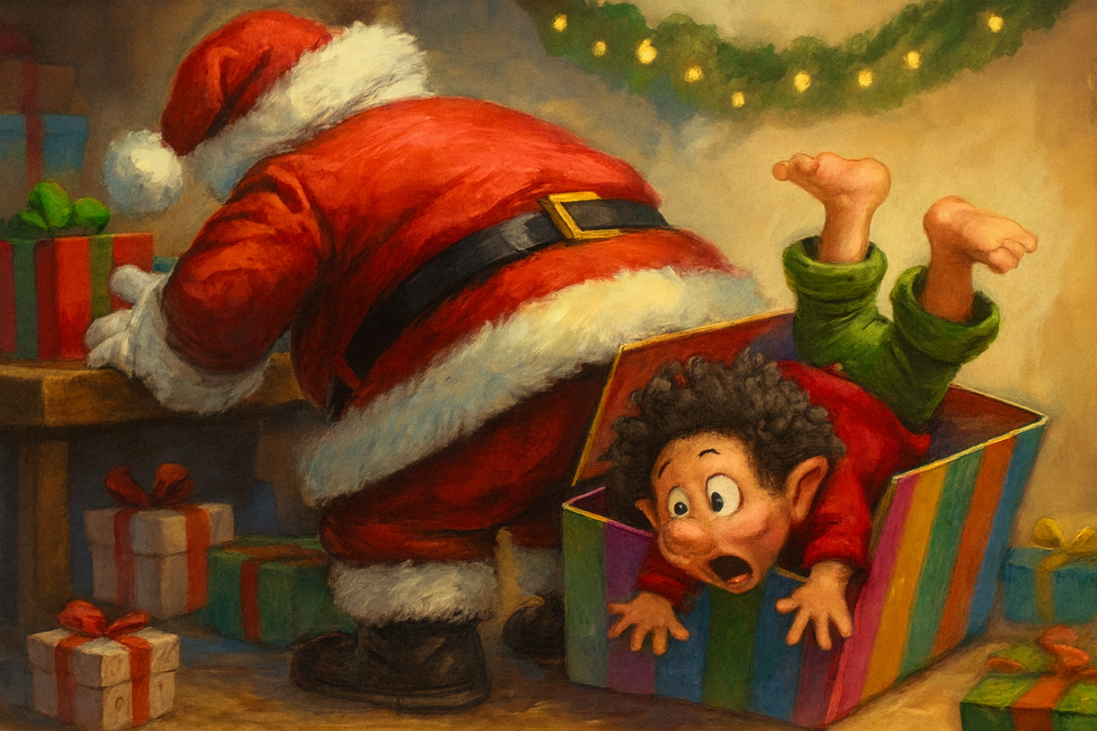 Das ist eine verantwortungsvolle Aufgabe und somit eine wirkliche Auszeichnung. Nach dem Hin und Her der letzten Tage ist dies nun mal eine recht entspannende Tätigkeit. Ab und zu muss er freilich etwas beanstanden. „Elli, so pass doch auf! Hier soll ein Märchenbuch rein, keine CD!“ Elli schnappt sich die CD und stürmt los, zurück in die Werkstatt. Die Zeit eilt, und Fehler können sie sich eigentlich gar nicht leisten. Es sind die letzten Pakete, die heute gepackt werden. Der Weihnachtsmann kommt vorbei und nickt anerkennend: „Gut so, Nepomuck!“ Nepomuck strahlt wie ein Honigkuchenpferd. Endlich ist auch das letzte Päckchen gepackt. Nepomuck beugt sich weit über den Karton. Da, die Trillerpfeife ertönt! Schnell, schnell. Nur noch kontrollieren. Jemand weint laut, Nepomuck blickt nicht auf. Er will schließlich fertig werden. Der Weihnachtsmann steht noch immer hinter ihm und beugt sich jetzt zu dem weinenden Kobold hinunter.