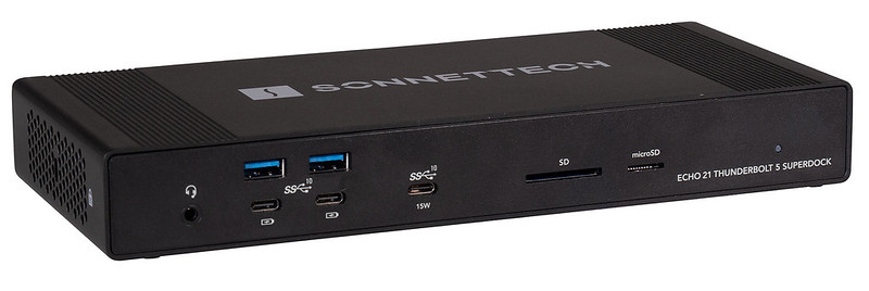 Auf dem Branchentreff stellt Sonnet zwei neue Thunderbolt 5-Dockingstationen der nächsten Generation vor: Echo 20 Thunderbolt 5 SecureDock und Echo 21 Thunderbolt 5 SuperDock. Die Dockingstationen bieten zahlreiche Anschlussmöglichkeiten, darunter drei Thunderbolt 5-Anschlüsse, einen 10-Gigabit-Ethernet-Anschluss (RJ45), vier 10-Gbit/s-USB-C-Ladeanschlüsse mit 7,5 Watt, einen 10-Gbit/s-USB-C-Ladeanschluss mit 15 Watt, vier 10-Gbit/s-USB-A-Anschlüsse, je einen HDMI- und DisplayPort-Anschluss, zwei analoge Line-Level-Ausgangsbuchsen, eine 3,5-mm-Mikrofonbuchse, eine 3,5-mm-Kombi-Audiobuchse, einen SD 4.0-Kartensteckplatz und einen microSD-Kartensteckplatz.